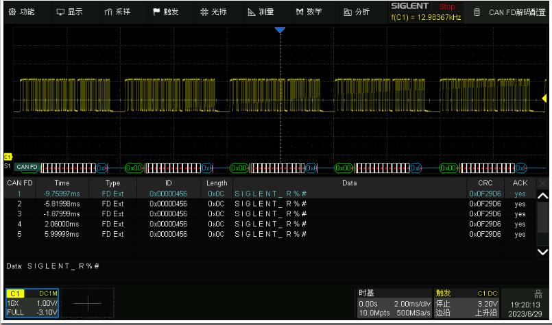 新款SDS1000X HD在保持標(biāo)配IIC、SPI、UART、CAN、LIN的基礎(chǔ)上,還新增標(biāo)配FlexRay(僅解碼)與CAN FD(僅解碼)。FlexRay是一種用于汽車的高速的、可確定性的,具備故障容錯(cuò)能力的總線技術(shù),它將事件觸發(fā)和時(shí)間觸發(fā)兩種方式相結(jié)合,具有高效的網(wǎng)絡(luò)利用率和系統(tǒng)靈活性特點(diǎn),而CAN FD協(xié)議作為一個(gè)新興的車載網(wǎng)絡(luò)技術(shù)具備低成本、高可靠性、高傳輸速率等優(yōu)點(diǎn),廣泛應(yīng)用于動(dòng)力、底盤、安全系統(tǒng)等。