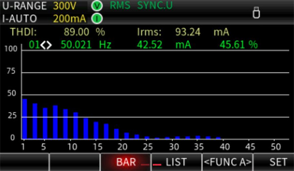 諧波測量有柱形圖(BAR)和列表(LIST)值兩種顯示模式 完全符合諧波測量國際標準IEC61000-4-7:2002, 根據基波頻率,電壓、電流、功率分別可測量到最多50次諧波, 總諧波失真(THD),還是基波成分、各次數的諧波含量、相位差、諧波失真因數等均可測量。 諧波分析次數的上限值可在1~50次之間自由設置,對THD運算上限次數有規(guī)定的場合也可按照其規(guī)格進行運算。
