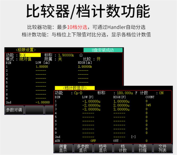比較器功能:多10檔分選,可通過Handler自動(dòng)分選