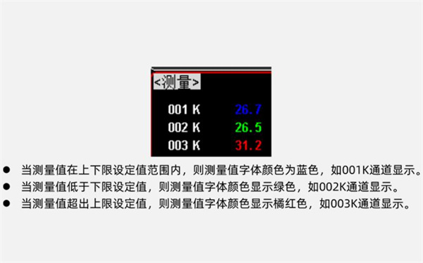 特設溫度上下限超限報警,和超限讀數(shù)顏色變化警示,可對每一路溫度數(shù)據(jù)進行上限和下限設置。