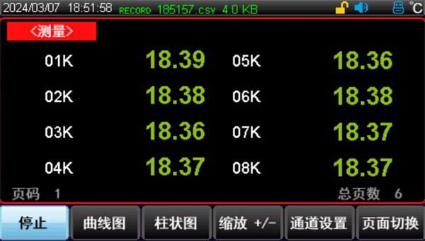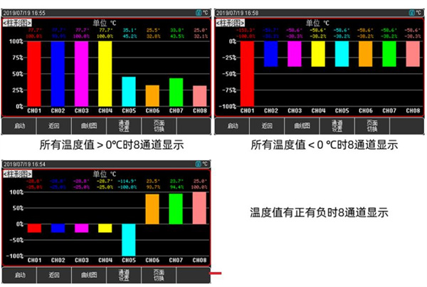 自動模式:同一組測試模塊上8個通道溫度數(shù)值高低百分比比較,用于比較8個通道測試數(shù)值的高低,儀器一般默認自動模式。 手動模式:對當前測試通道的溫度在所設定的溫度范圍區(qū)間的比重,可以直觀觀察到所測溫度距離超限值的距離。