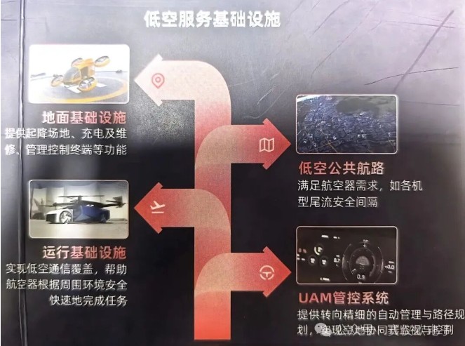 含地面設施(提供起降場地、充電及維修、管控終端等功能)、運行設施(低空通信覆蓋,幫助飛行器感知環(huán)境、安全完成任務)、公共航路(滿足航空器需求,如各機型尾流安全間隔)、UAM 管控系統(tǒng)(提供轉(zhuǎn)向精細的自動管理和路徑規(guī)劃,實現(xiàn)空地協(xié)同式監(jiān)視與控制),保障安全運行。