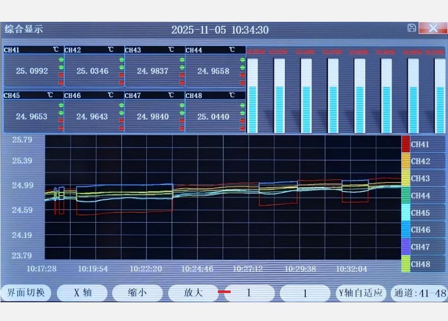 該界面顯示同一模塊的8個(gè)通道數(shù)據(jù)的變化趨勢(shì),右邊為采集到的實(shí)時(shí)數(shù)據(jù),同時(shí)例舉出每個(gè)通道在曲線圖中選用的顏色。橫軸代表時(shí)間,縱軸代表采集到的數(shù)據(jù)。點(diǎn)擊曲線操作按鈕,可對(duì)曲線進(jìn)行相應(yīng)的操作,如放大、縮小、修改坐標(biāo)軸、切換通道。