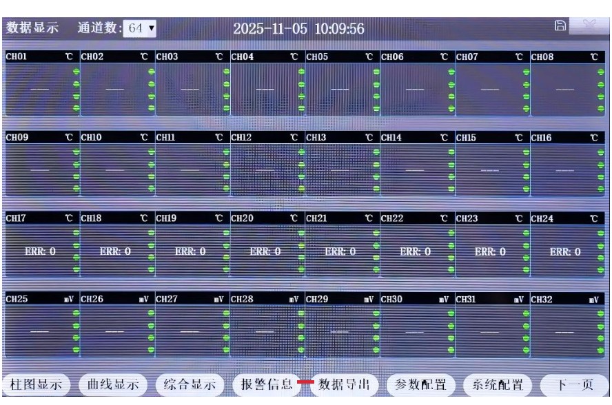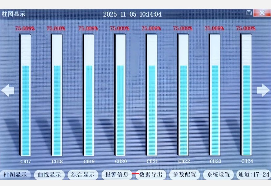 數(shù)據(jù)會(huì)按照比例顯示在柱形圖中,頂端為100%,底端為0%。每個(gè)模塊的8個(gè)通道作為一組數(shù)據(jù),同時(shí)顯示在屏幕上。當(dāng)通道數(shù)據(jù)超過任意一種限定值時(shí),頂端會(huì)呈現(xiàn)紅色,當(dāng)數(shù)據(jù)在合理區(qū)間后,會(huì)變?yōu)榘咨?/span>