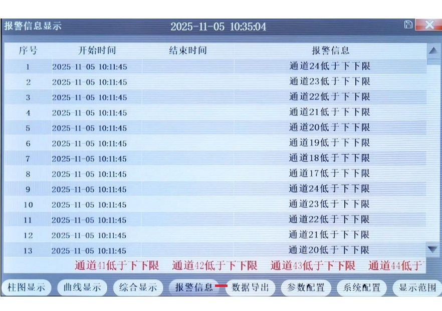 報(bào)警信息顯示通道不符合界限的開始時(shí)間和結(jié)束時(shí)間;下方紅色字體會(huì)循環(huán)滾動(dòng)當(dāng)前超過界面的相關(guān)通道的報(bào)警信息。用戶通過點(diǎn)擊右方滑動(dòng)條的上下箭頭單步滑動(dòng),也可滑動(dòng)滑動(dòng)條來快速瀏覽系統(tǒng)內(nèi)部記錄的報(bào)警信息。