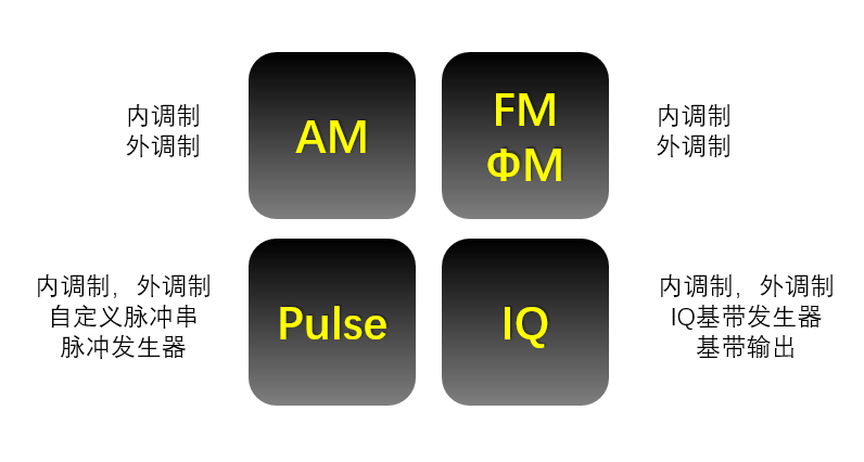 標配調(diào)幅,調(diào)頻,調(diào)相等模擬調(diào)制方式以及脈沖調(diào)制和脈沖發(fā)生器,可選可用戶自定義的脈沖序列,以及I/Q調(diào)制和IQ基帶發(fā)生器,可生成QAM、ASK、PSK、FSK、MSK等各種常用的調(diào)制信號;所有調(diào)制都支持內(nèi)部和外部調(diào)制源。