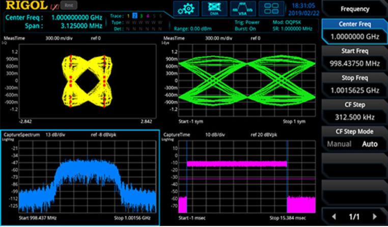 矢量信號(hào)分析功能VSA支持多種數(shù)字調(diào)制格式,如QAM,PSK,MSK、ASK、FSK等。通過該功能進(jìn)行快速地解調(diào),展示其星座圖,眼圖(基帶信號(hào)),頻譜圖,解調(diào)數(shù)據(jù)等多維數(shù)據(jù),從而發(fā)現(xiàn)設(shè)計(jì)中存在的問題。