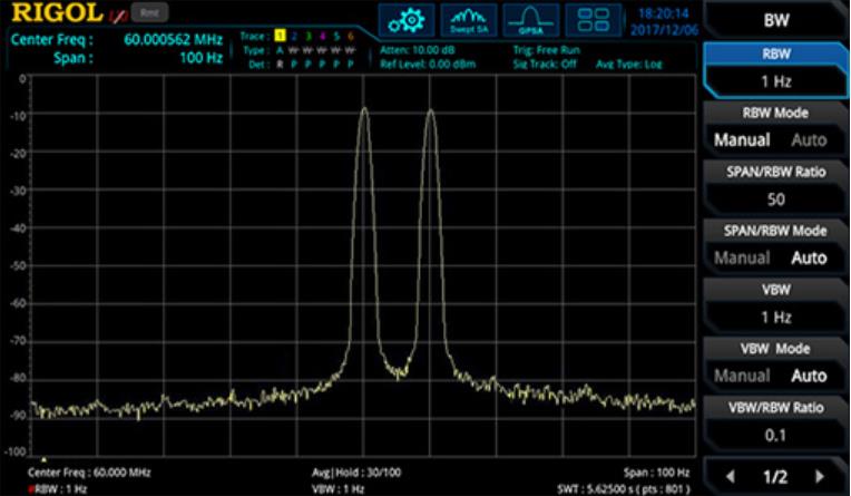 分辨頻率相近的信號對于驗證許多RF器件和系統(tǒng)至關(guān)重要。使用RSA3000,掃描頻寬僅為1 Hz的RBW分辨率帶寬,可以查看相鄰信號的更多細(xì)節(jié)。