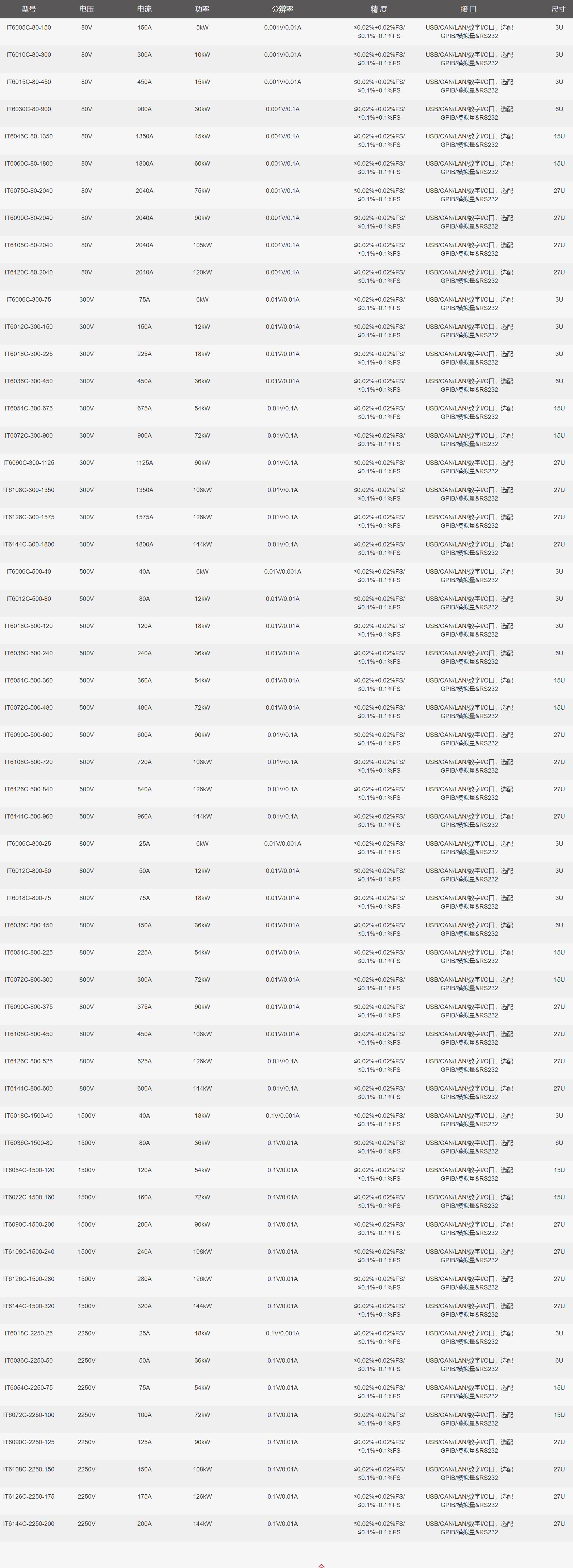 IT6000C系列是一款集雙向電源和回饋式負(fù)載功能特性于一體的雙向可編程直流電源,既能實現(xiàn)source的功能,提供功率;又具備sink能力,不但可以吸收功率還能將消耗的能量清潔的返回至電網(wǎng),具有標(biāo)準(zhǔn)的雙象限功能。IT6000C電壓可至2250V。利用主從模式支持并聯(lián),主動均流,功率可擴(kuò)展至1.152MW。內(nèi)置函數(shù)發(fā)生器,可以自由的產(chǎn)生任意波形,并通過USB接口導(dǎo)入LIST文件生成波形。具有高可靠性的設(shè)置功能和保護(hù)特性,豐富的測量功能使IT6000C系列廣泛應(yīng)用于汽車電子、綠色能源、高速測試、大功率測試等多個方面,是一款功能豐富、性能優(yōu)異、適用廣泛的直流電源。