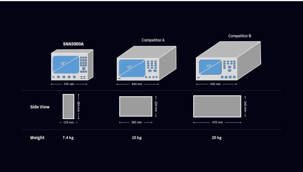 不管是在研發(fā)還是在現(xiàn)代化的生產(chǎn)線,區(qū)別于傳統(tǒng)笨重的矢量網(wǎng)絡(luò)分析儀,SNA5000A超前的外觀設(shè)計(jì)都能為工程師或者產(chǎn)線節(jié)省大量的桌面空間。