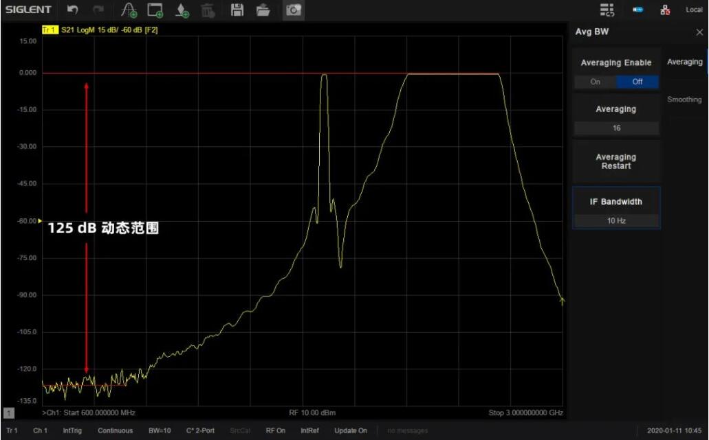 系統(tǒng)動(dòng)態(tài)范圍是VNA一個(gè)非常重要的指標(biāo),它是VNA源的最大輸出功率與測(cè)試端口本底噪聲的差值。SNA5000A擁有最大125 dB的動(dòng)態(tài)范圍,可適用于對(duì)動(dòng)態(tài)范圍要求比較高的測(cè)試場(chǎng)景,比如同時(shí)測(cè)量濾波器的通帶和帶外抑制性能。