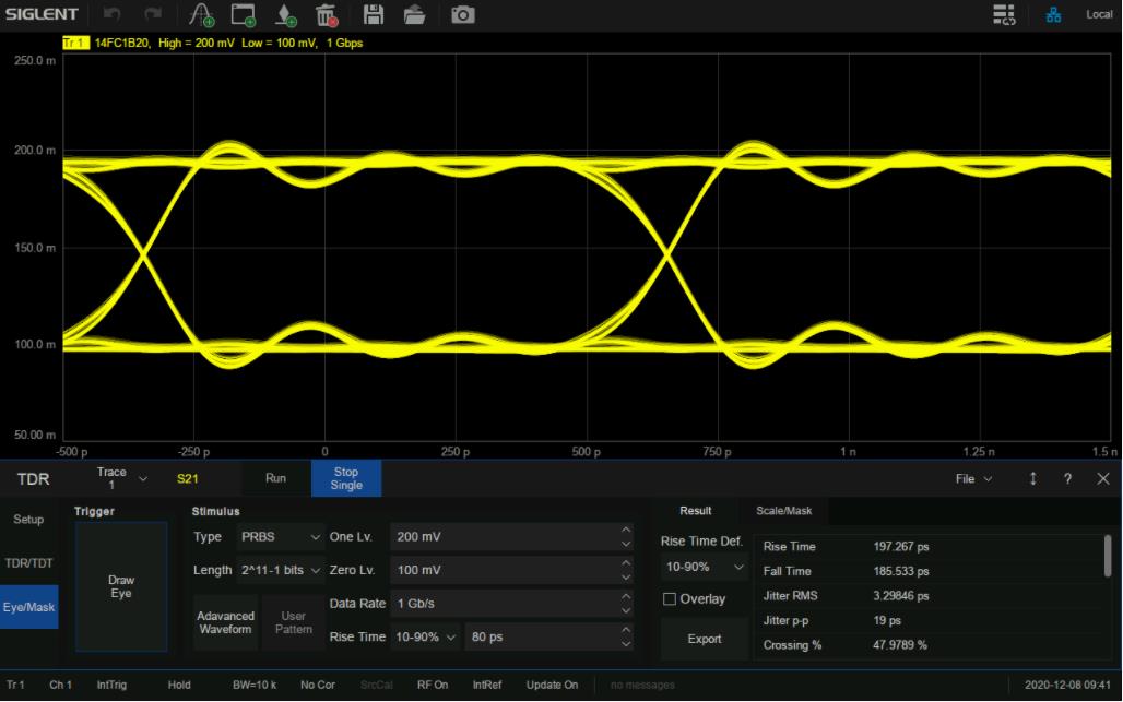 SNA5000X搭載了眼圖功能,眼圖可以反映信號鏈路上傳輸?shù)臄?shù)字信號的整體特征,從中觀察出碼間串?dāng)_和噪聲的影響,進而估計系統(tǒng)的優(yōu)劣程度。眼圖分析是高速系統(tǒng)信號完整性分析的核心,為需要對高速信號進行時域分析的客戶節(jié)省了大量成本和時間。
