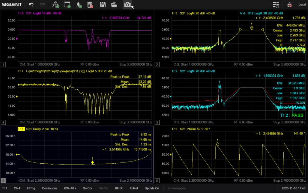 SNA5000X系列支持在多個窗口添加多條跡線進行全4端口S參數(shù)測試,并且具備多種顯示格式,比如 Log Mag,Lin Mag,Phase,Delay,Smith,SWR,Polar等,可以方便快捷地分析被測物的傳輸系數(shù),反射系數(shù),駐波比,阻抗匹配,相位,延時等參數(shù)。在生產(chǎn)線驗證天線,濾波器等的特性時,還可以保存參考跡線或者添加Limit模板進行通過失敗測試,有利于提高生產(chǎn)效率。
