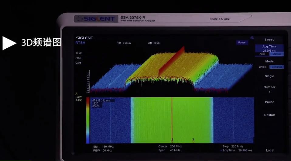 · 實(shí)時(shí)頻譜模式:支持Density,3D,Spectrogram,PvT等多種顯示方式,多維度觀察復(fù)雜瞬變信號(hào)