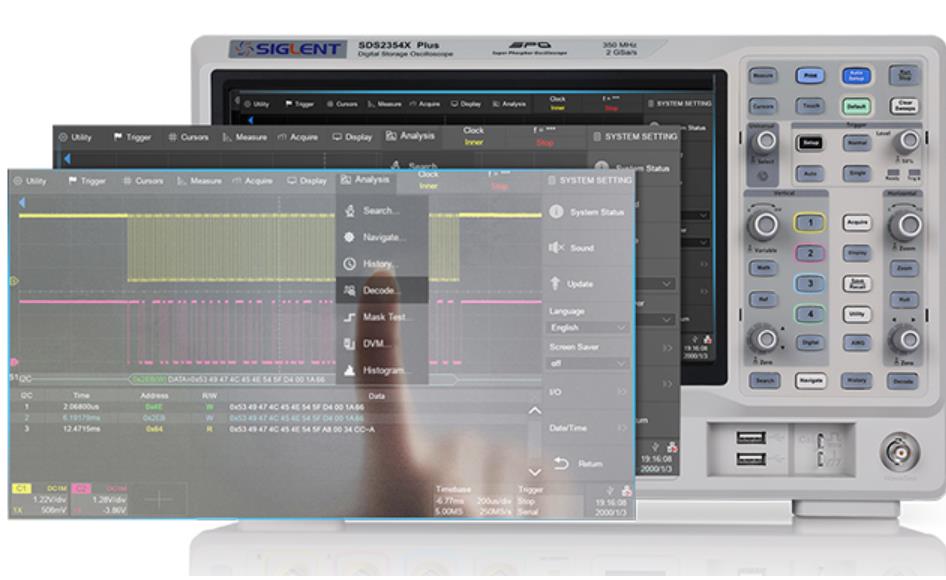 SDS2000X Plus 系列混合信號(hào)數(shù)字示波器,最大帶寬 500 MHz, 采樣率最高 2 GSa/s,具備最多 4 個(gè)模擬通道和 16 個(gè)數(shù)字通道, 存儲(chǔ)深度可達(dá) 200 Mpts/通道。SDS2000X Plus 采用的 SPO 技 術(shù),波形捕獲率高達(dá) 500000 幀/秒,具有 256 級(jí)輝度等級(jí)及色 溫顯示;創(chuàng)新的數(shù)字觸發(fā)系統(tǒng),觸發(fā)靈敏度高,觸發(fā)抖動(dòng)??;支 持豐富的智能觸發(fā)、串行總線觸發(fā)和解碼;支持歷史(History) 模式、分段采集(Sequence)、模板測(cè)試、搜索、導(dǎo)航、波特圖 和電源分析等高級(jí)分析模式;具備豐富的測(cè)量和數(shù)學(xué)運(yùn)算功能; 10-bit 模式提供更高精度的數(shù)據(jù)采集與處理。