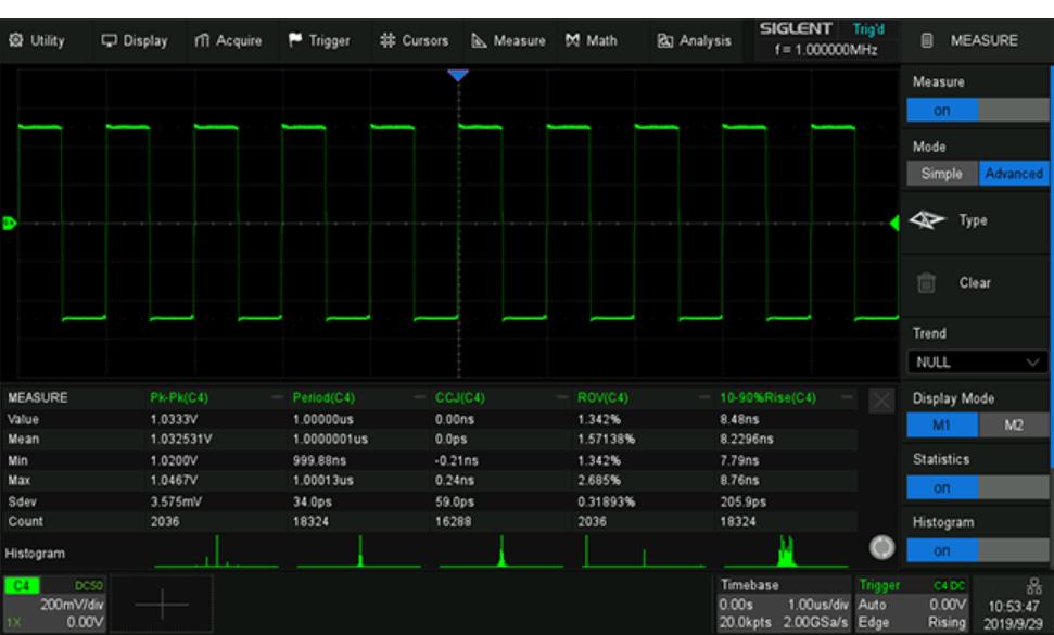 參數(shù)統(tǒng)計(jì)功能可顯示任意參數(shù)的五種測(cè)量值:當(dāng)前值、平均值、最小值、最大值、標(biāo)準(zhǔn)差;可同時(shí)測(cè)量統(tǒng)計(jì)12種不同的參數(shù)。直方圖統(tǒng)計(jì)可以直觀地顯示參數(shù)的概率分布情況;趨勢(shì)圖可反應(yīng)參數(shù)隨時(shí)間的變化規(guī)律。