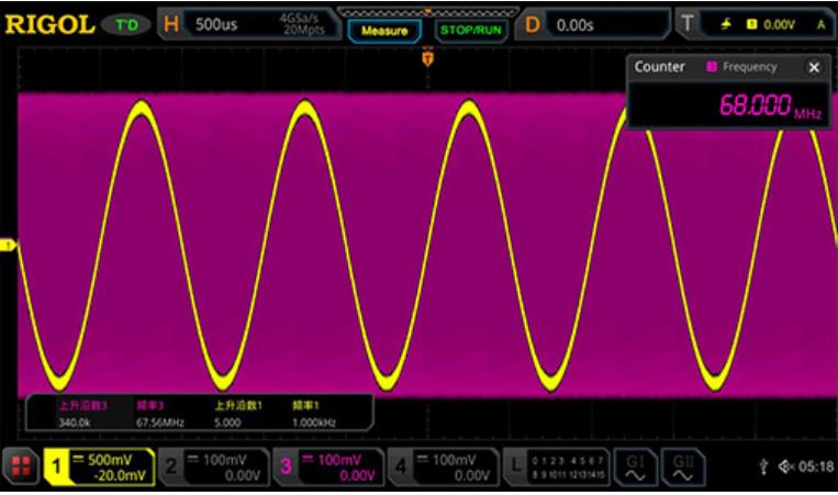 同時(shí)觀察并準(zhǔn)確測(cè)量?jī)陕奉l率相差很大的信號(hào),全內(nèi)存硬件測(cè)量可以在具有340k個(gè)上升沿的波形中測(cè)得準(zhǔn)確的頻率值。