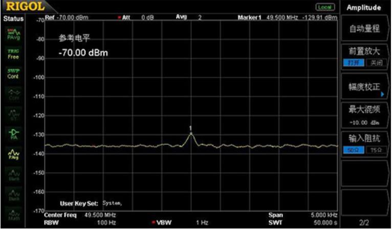 微弱信號的測試容易受到頻譜儀本身的本底噪聲影響。DSA700系列顯示平均噪聲電平低至-130dBm(歸一化到100Hz),可以有效保證對微弱信號的測試能力。