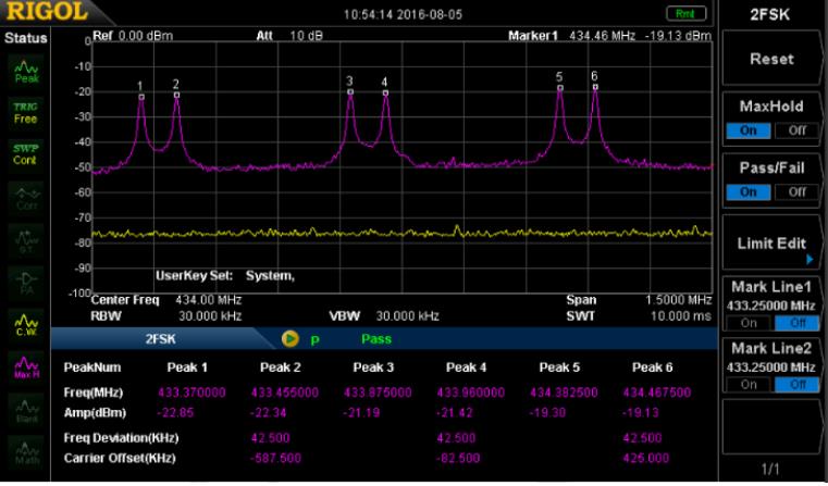 汽車遙控鑰匙,TPMS胎壓模塊及小無線模塊等通常使用ASK/FSK調(diào)制。DSA700可通過SSC-DSA功能擴展來完成ASK/FSK信號的抓取,并且內(nèi)置2FSK測試功能,可直接獲取其中心頻率、功率及偏移等參數(shù)。