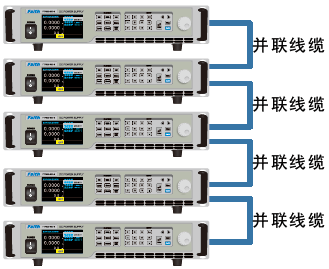 FTP電源支持多臺電源的主從并聯/串聯使用,把多臺電源變成一臺更大功率的電源使用,大大擴展了電源的應用輸出范圍。級聯功能除了使電源之間自動均載,保持輸出值的一致,還保證了輸出斜率曲線或者波形的一致。處于級聯狀態(tài)的主機,電源屏幕顯示的是總電壓、電流和功率值,且不影響電源精確度。每路從機自主均流,自動求和。