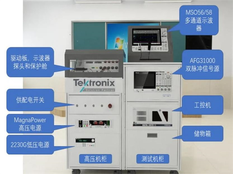 該系統(tǒng)由泰克高分辨率示波器,光隔離探頭,雙脈沖信號源,高壓電源,功率器件雙脈沖測試驅(qū)動板,防護艙,芯片溫控系統(tǒng),和自動化測試軟件組成。以機柜系統(tǒng)形式交付客戶,可以通過上位機軟件配置測試設備和測試項目,獲取測試結(jié)果并生成數(shù)據(jù)報告。